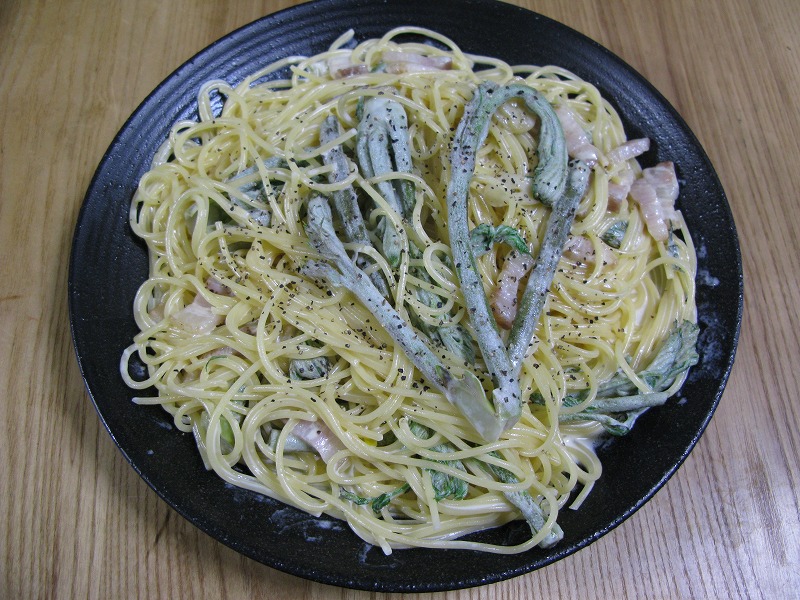 パスタ。ベーコンとニンニクと生クリームです。アスパラよりツーランク程レベルが上がります。