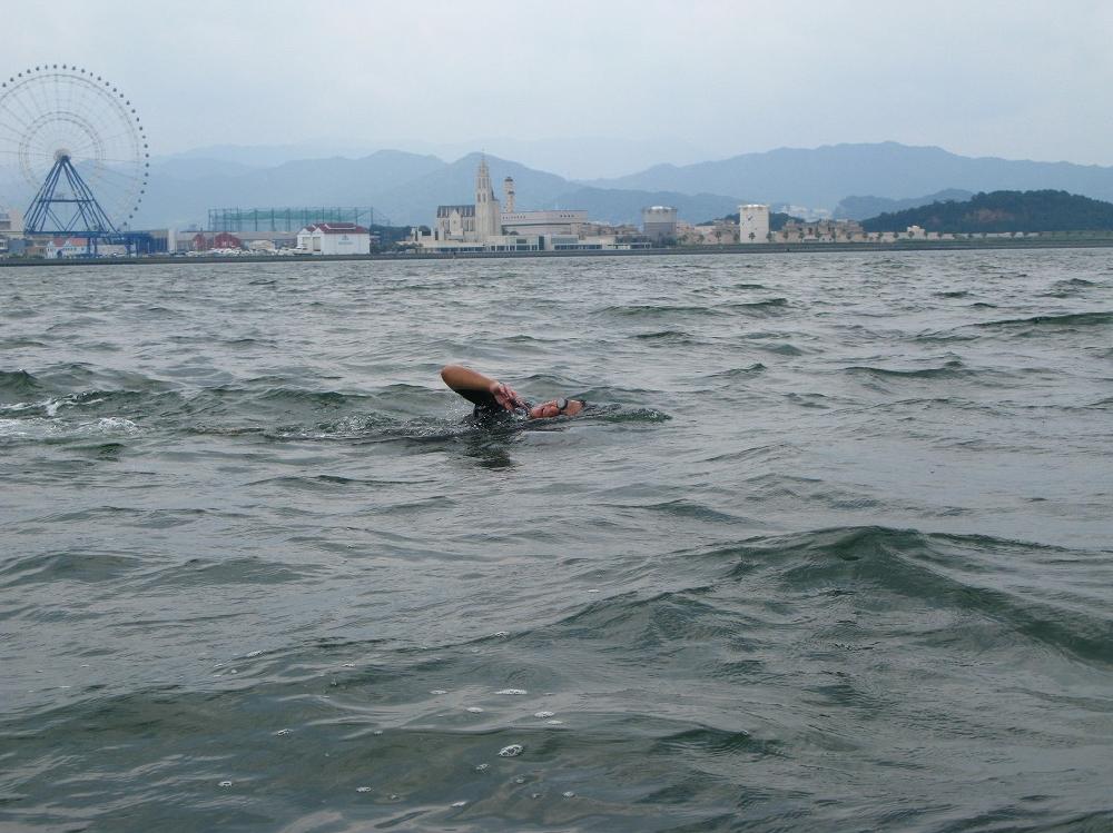 当日は予報よりも南西の風が強く吹いていました。伴走してみると、泳ぎの方がカヤックよりも風の影響を受けません。ただ、島などへ渡る場合、視点が低いため方向のキープが難しいようです。カヤックのバウで進行方向を示します。