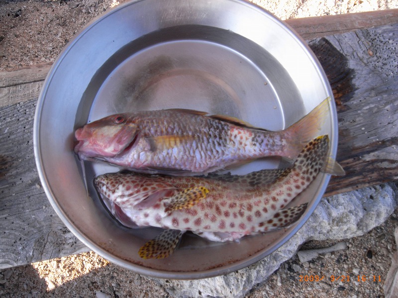 約10分程のトローリングで釣れたサカナ。オジサン(上)とミーバイ(下)。ゴンちゃんが炊き込みご飯にしてくれました。