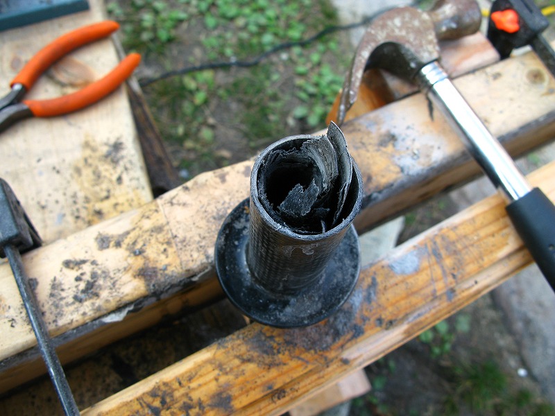 相変わらず選択肢の少ない4ピースパドルですが、2ピースを改造して4ピースに。ブレード部分からぶった切ってスリーブを接着すればOK、と考えてしまいますが、事はそんなに簡単ではない。通常のパドルはブレードとシャフトの結合部分には補強のインナーパイプが接着されています。4ピース用のインナースリーブを挿入するには、そいつを削り取らなければなりません。これはニンバスのチヌークです。愛用してますがもう廃版品なので、失敗は許されません。緊張。