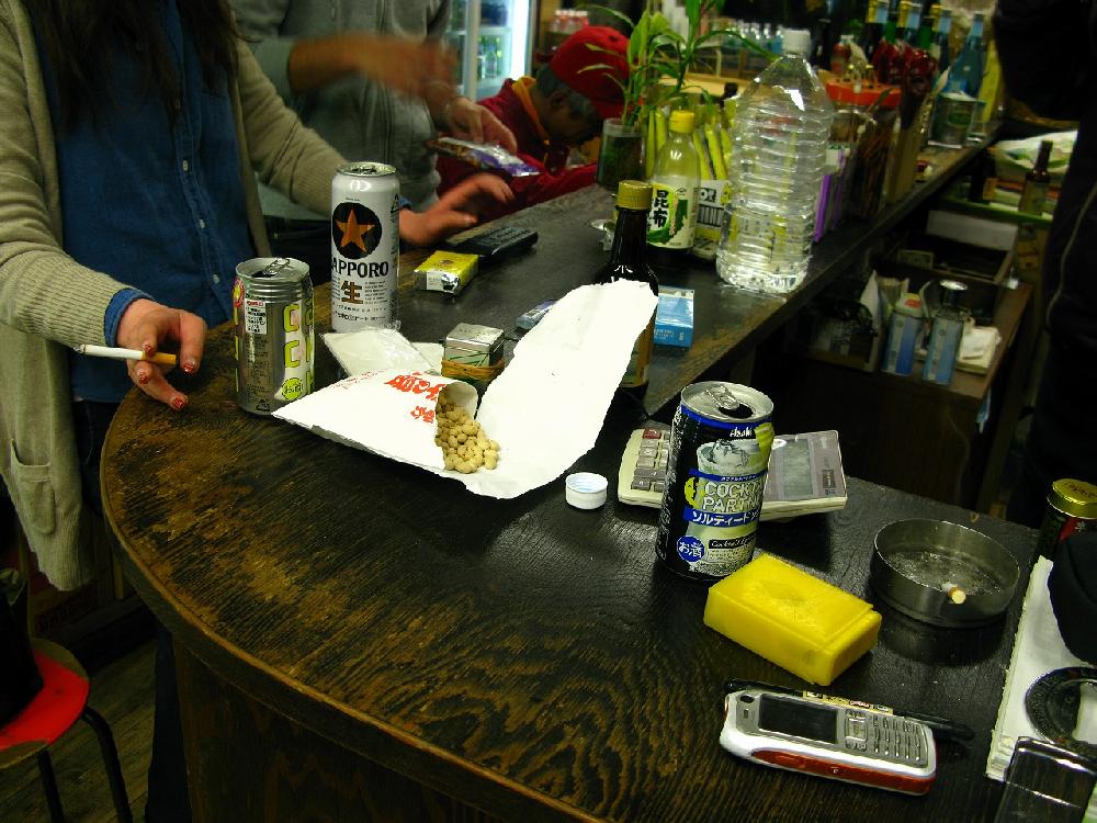 節分の夜。東京はみぞれ混じりの雪でした。某所の角打にてマメを頂きました。