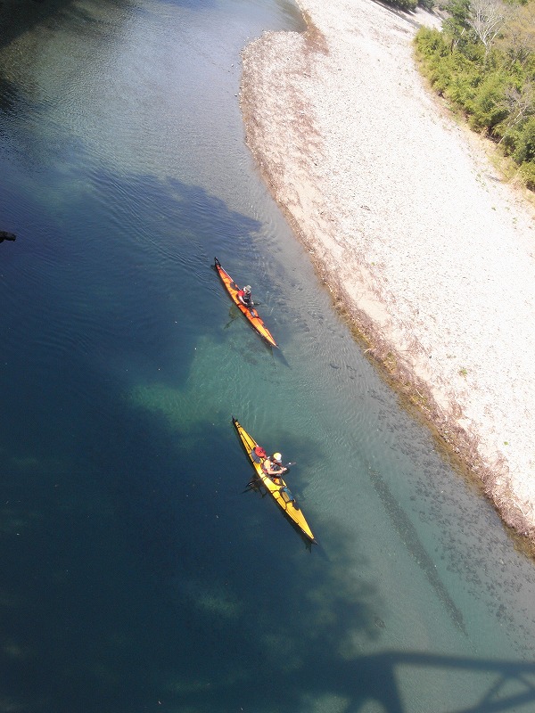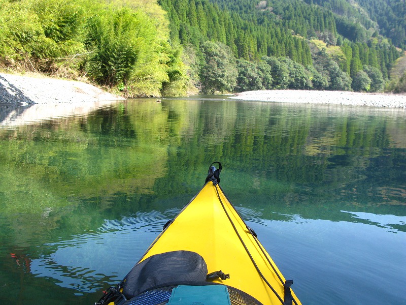 たまに現れるチャラ瀬をチャラく下るくらいで、ホワイトウォーターは皆無です。そいうのを求める方には不向きですが、水の美しさと「川らしい川」でたまには遊びたい向きには最適です。この時期は水が少なく何度もライニングダウンを強いられましたが、それもまた良し。チャラ瀬かなりゴツゴツやりながら下りましたがフェザーのボトムはまったく平気です。