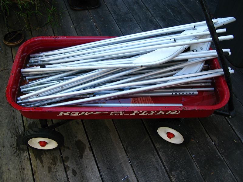 フェザークラフトをご検討中の方からのご質問で一番多いのが「使用後のメンテナンス」に関してです。毎度毎度の塩抜き、乾燥が必要と思われがちなところに、「私は基本的にカヤック(特に自分の)は洗いません」と言うとびっくりされます。現在仕事での使用頻度がもっとも高いウィスパーですが、夏シーズンに入ってから一度も洗ったり分解したりしていません。組んでから2~3ヶ月たって思いたったらバラします。それが今日でした。水を張った容器にフレームを放り込みました。スキンは・・・今回は洗いません。