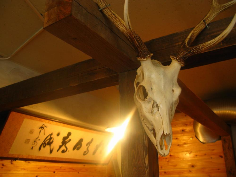 これは事務所の風景。なぜか鹿の頭と山岡鉄船の書。