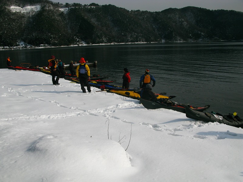 休憩にあがった浜もこの通り。カヤックが雪の上を滑るので出艇は楽です。ここから先は沿岸に道も無く、原始の自然を堪能できるエリアです。風吹かなくて良かったあ~でも明日は凄そう。