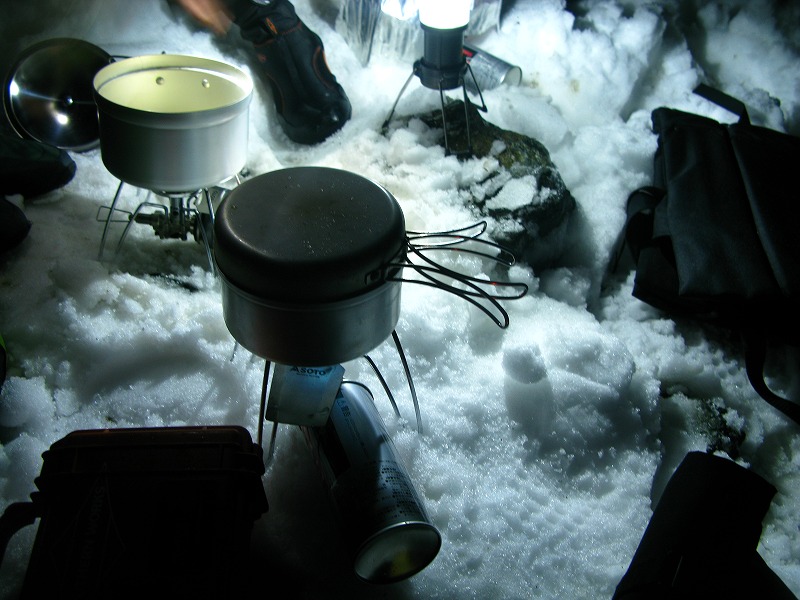 ドッカリ積もったキャンプサイトではまず焚き火を熾し、テントの設営。カヤックでのキャンプでシャベルを使って整地したのは初めてでした。肉食九州チームは全員SOTOのレギュレーターストーブとユニフレームのツアラープラスで調理。カセットガスの限界に挑戦です。普通のカセットガスでも大丈夫ですが、SOTO純正のパワーガスを使えばまったく問題なし。