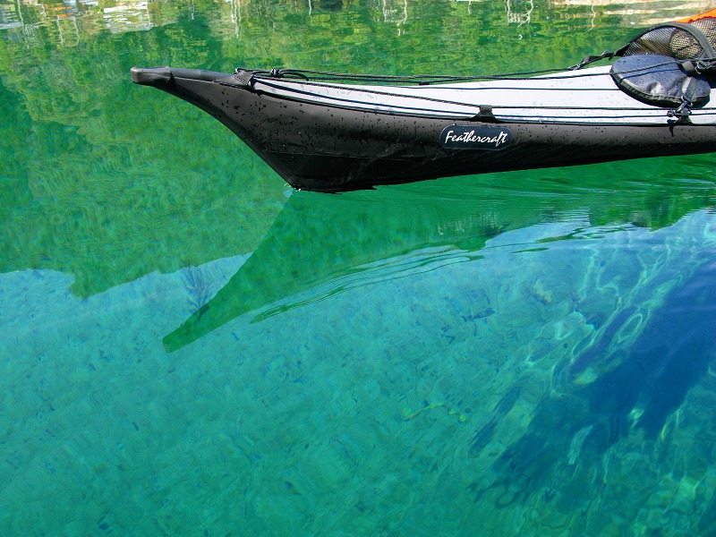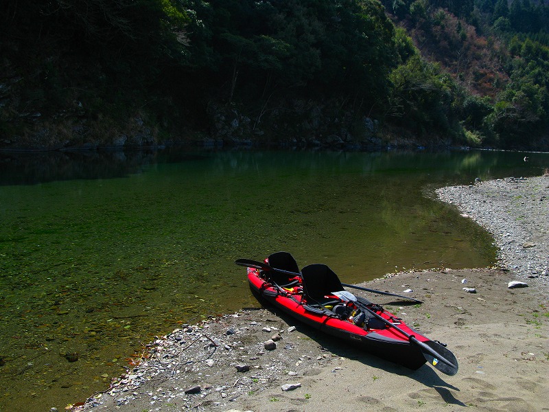 淡水での進水式だったM氏のウィスパーXP。いきなりのハードな使用状況(瀬が浅いので)。