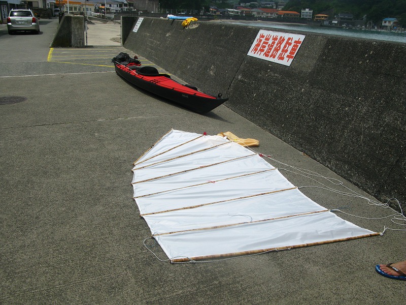 手前の帆は新郎所有の仲村さんのフェザークラフト用サバニセールです。